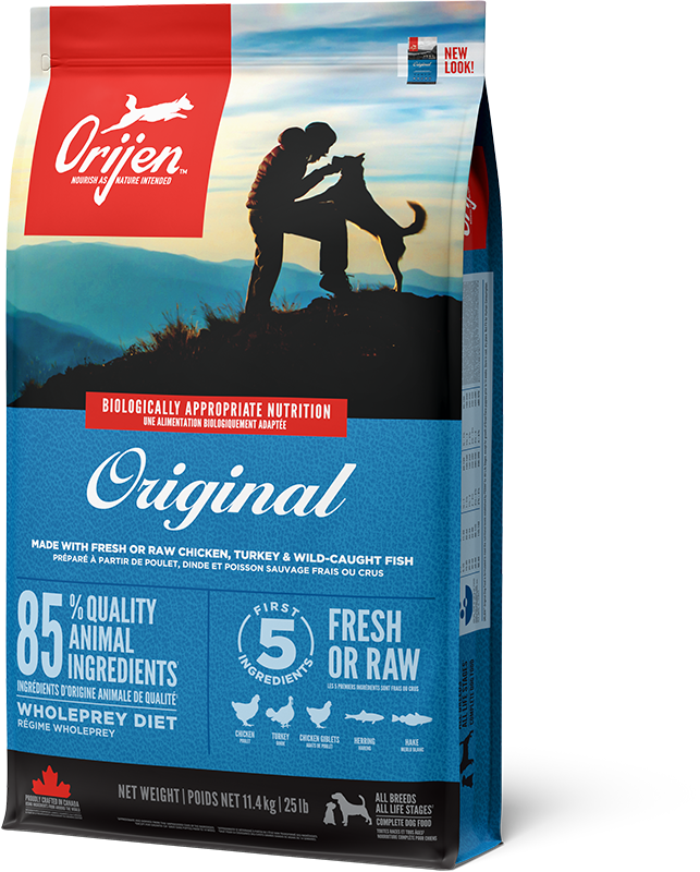 Just like their ancestor, the grey wolf, all dogs are meant to eat a diet rich and varied in whole animal ingredients. ORIJEN Original is made with meat, organs, cartilage, and bone from free-run chicken and turkey, wild-caught fish, and cage-free eggs that are delivered to our kitchen. Two-thirds of our animal ingredients are FRESH or RAW, for a concentrated source of protein. With richly nourishing protein and infusions of freeze-dried liver, this recipe nourishes your dog as nature intended while offering them a flavour that they’ll love.