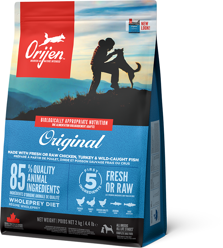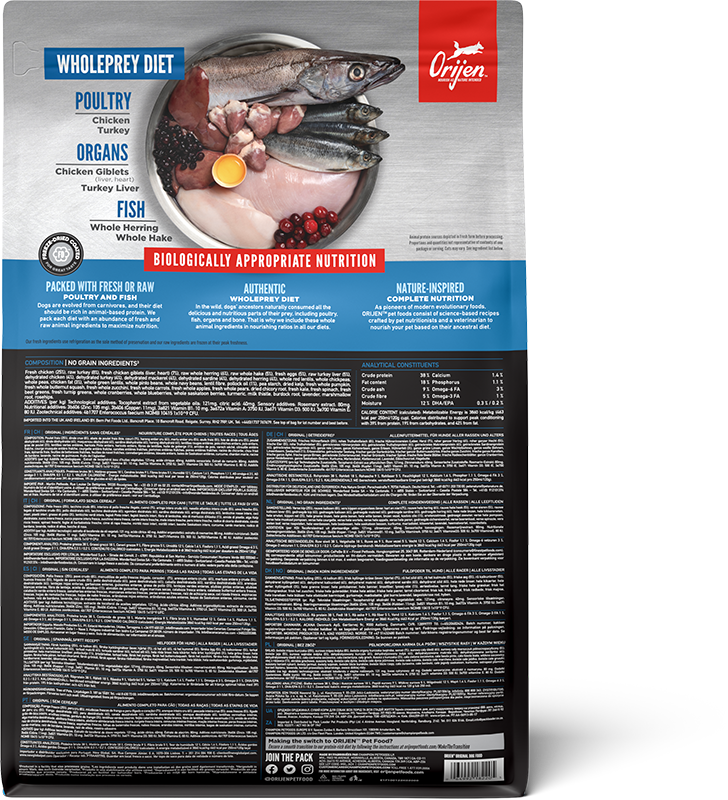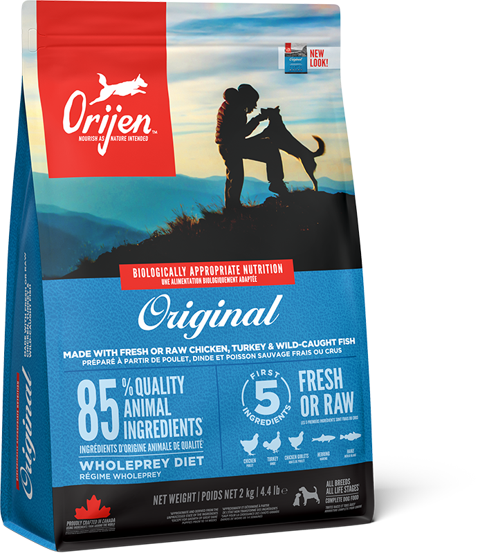 Just like their ancestor, the grey wolf, all dogs are meant to eat a diet rich and varied in whole animal ingredients. ORIJEN Original is made with meat, organs, cartilage, and bone from free-run chicken and turkey, wild-caught fish, and cage-free eggs that are delivered to our kitchen. Two-thirds of our animal ingredients are FRESH or RAW, for a concentrated source of protein. With richly nourishing protein and infusions of freeze-dried liver, this recipe nourishes your dog as nature intended while offering them a flavour that they’ll love.
