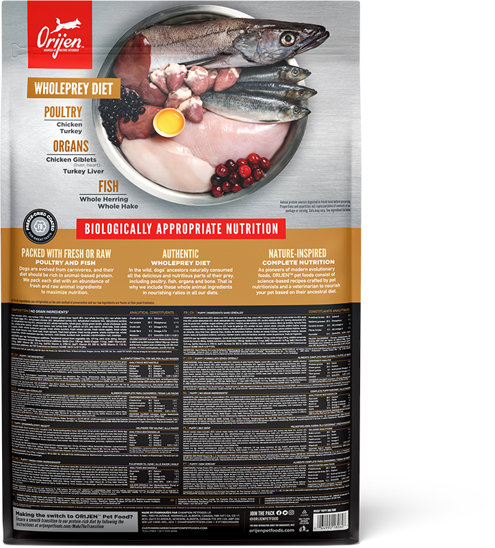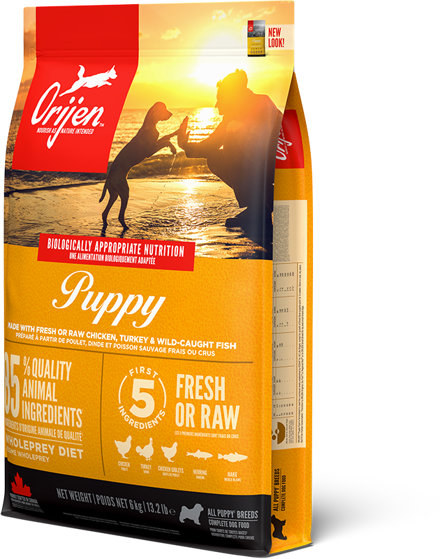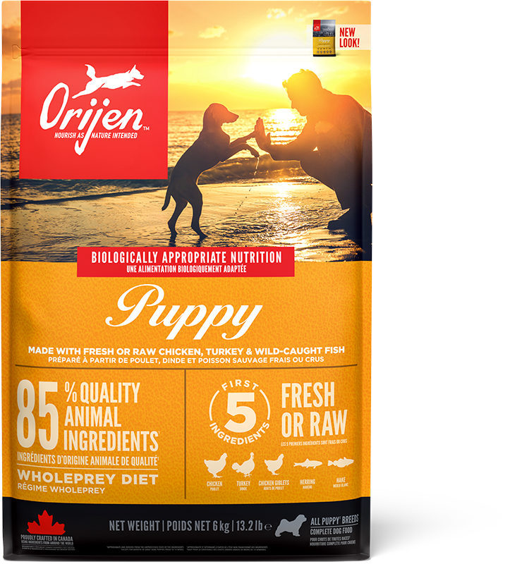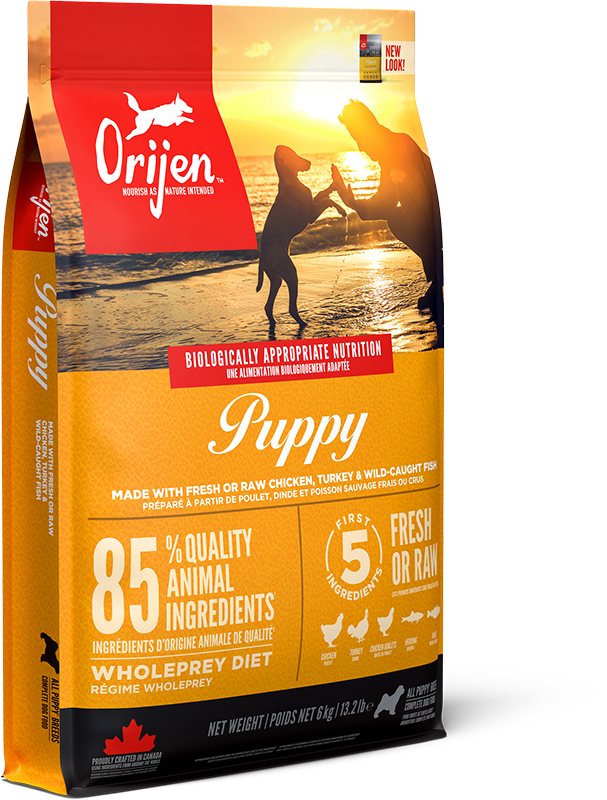 All puppies do best on a diet that is rich in protein and fat from whole animal ingredients to support peak growth and development. ORIJEN Puppy is brimming with protein from free-run chicken and turkey, wild-caught fish, and cage-free eggs that are delivered to our kitchen. Two-thirds of our animal ingredients are FRESH or RAW, for a concentrated source of protein. The result is a nutrient-dense and delicious recipe that your puppy will love.